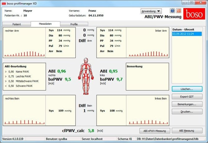Das boso ABI-System 100 PMV mit Pulswellenmessung ist ein zuverlässiges und effizientes Gerät zur nichtinvasiven Erfassung des Ankle-Brachial-Index (ABI) und der Pulswellengeschwindigkeit (PWV) für die Gefäßgesundheit. Mit der optionalen Pulswellen-Messung können Kunden die arterielle Gefäßsteifigkeit bewerten. Die Messung ist schnell, einfach und kann sogar von Mitarbeitern durchgeführt werden. Das Gerät misst den systolischen Blutdruck an Armen und Beinen genau und ermöglicht die Erfassung wichtiger kardiovaskulärer Parameter. Das boso ABI-System 100 PMV ist in zwei Varianten erhältlich: mit Manschetten für Armumfänge von 38 cm oder 42 cm. Beide Varianten bieten die gleichen fortschrittlichen Funktionen und Software, um die Messungen präzise und zuverlässig durchzuführen. Die Geräte sind einfach anwendbar, verursachen minimale Schwankungen bei der Messung und übertragen die Daten problemlos an einen PC über die USB-Schnittstelle. Kunden wählen dieses Produkt aufgrund seiner Genauigkeit, Zuverlässigkeit und Benutzerfreundlichkeit. Die Möglichkeit, den Ankle-Brachial-Index und die Pulswellengeschwindigkeit einfach und schnell zu messen, macht das boso ABI-System 100 PMV ideal für medizinische Einrichtungen, die eine zuverlässige Gefäßuntersuchung durchführen möchten. Mit seiner leistungsfähigen Software und der Fähigkeit, wichtige kardiovaskuläre Parameter zu berechnen, ist dieses Gerät ein unverzichtbares Werkzeug für die Gefäßdiagnostik.