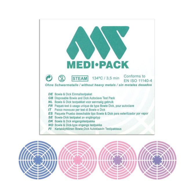 Beschreibung Medi Pack Bowie Dick – Farbkontrollsystem Der MediPack Bowie Dick ist ein Einmaldampfsterilisatortest für Autoklaven Typ B. Einfache Handhabung und Dokumentation Perfekte Handhabung Sicherer, stabiler Farbumschlag Schwermetallfrei