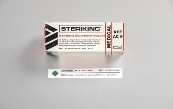 Beschreibung Wipak Steriking® Dampf-Kontroll-Indikator Typ AC6 Der Dampfkontroll-Indikatorstreifen von Steriking® verfärbt sich bei Kontakt mit Dampf von Grün in Braun. Damit eine Verfärbung stattfinden kann, müssen die Parameter in der korrekten Kombination aus Temperatur, Zeit, Feuchtigkeit und Sterilisationsmittel-Konzentration eingehalten werden. Der gebrauchsfertige Indikator dient der einmaligen Benutzung und wird in einer praktischen Entnahmebox mit 250 Indikator geliefert. EinzelindikatorDampfkontroll-Indikator