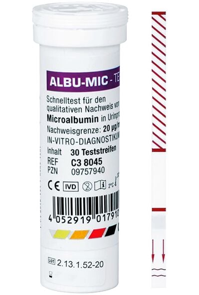 Beschreibung Cleartest Albu-Mic Nierenfunktions-Teststreifen Mit der Bestimung von Albumin im Urin können schon früh Hinweise auf eine Nierenfunktionsstörung erkannt werden. Die Nutzung der Teststreifen ist dabei ein einfacher aber zuverlässiger immunchemischer Test. Der qualitative Nachweis von Albumin im Urin kann auf einen drohenden Herzinfarkt, Diabetes und Bluthochdruck hinweisen. Das Testergebnis liegt nach nur 5 Minuten vor und es können sofort weitergehende Untersuchungen im Labor erfolgen oder Sofortmaßnahmen ergriffen werden. Gerade bei Risikopatienten ist der Albu-Mic Test eine große Hilfe. Immunchemischer TestZum qualitativen Nachweis von Albumin im UrinNachweisgrenze von 20 µg/mlErgebnis nach 5 Minuten