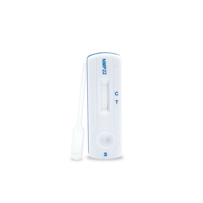 Beschreibung NADAL® Nuclear Matrix Protein 22 (NMP22) Schnelltest für das Blasenkrebs-VorsorgescreeningDer Test liefert ein qualitatives Ergebnis. Wenn genügend NMP22 in der Probe vorhanden ist, erscheint eine farbige Linie im Testlinienbereich (T) der Membran. Das Vorhandensein dieser gefärbten Linie zeigt ein ein positives Testergebnis. Die Nachweisgrenze liegt bei 20 U/mL.Für den NADAL® Nuclear Matrix Protein 22 Test wird entleerter Urin benötigt.