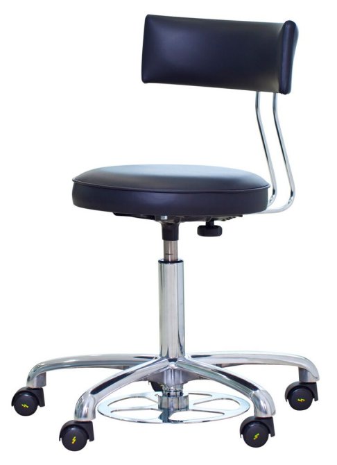 Beschreibung AGA OP-Drehstuhl mit Höhenverstellung und elektrisch leitfähigem Kunstleder-Polsterbezug in zwei Ausführungen Fußring mit einer Höhenverstellung von 490 bis 610 mmHandhebel mit einer Höhenverstellung von 460 bis 580 mm Die Sitzhöhen sind bei beiden Varianten stufenlos verstellbar. Das 5-armige Fußkreuz besteht aus poliertem Aluminium und hat einen Durchmesser von 61 cm. Die Sitzpolsterfläche mit 38 cm Durchmesser mit einer 75 mm-Polsterstärke ermöglicht ein bequemes und angenehmes Sitzen. Die Rückenlehne ist mit einer minimalen Neigung von 3° zur Sitzfläche angebracht und besitzt eine 45 mm starke Polsterung, sie ist neigbar und in der Höhe bis 160 mm verstellbar. Die Doppelrollen werden…