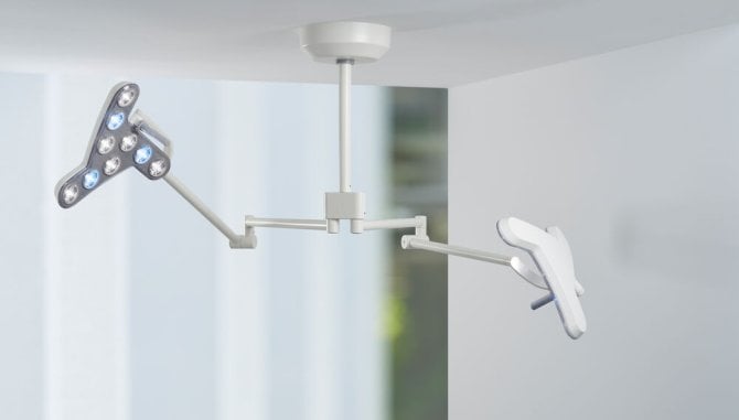 Derungs Triango130 DUO Doppelleuchtsystem: Qualitativ, Professionell, Zuverlässig, Praktisch Die Derungs Triango130 DUO Behandlungsleuchte bietet eine herausragende Beleuchtung für gleich zwei Behandlungsbereiche. Mit einem Doppelbeleuchtungssystem von 2 x 130.000 Lux gewährleistet sie eine gleichmäßige und umfassende Ausleuchtung des Operationsfeldes aus verschiedenen Winkeln. Schatten werden effektiv minimiert, was zu einer klaren Sicht auf sämtliche Eingriffsbereiche führt. Die Möglichkeit, die beiden Lichtquellen unabhängig zu positionieren und einzustellen, ermöglicht es dem OP-Team, die Lichtquellen optimal an die spezifischen Anforderungen anzupassen. Hauptmerkmale: – Lichtleistung: 2 x 130.000 Lux – Doppelbeleuchtungssystem – Ausleuchtungstiefe: 80 cm – Flexible Deckenmontage von 25 bis 120 cm – Hygienische Folientastatur für präzise Steuerung Vorteile: – Exzellente Farbwiedergabe-Eigenschaften (RA > 96) – Energieeffizienzklasse A+ für geringen Energieverbrauch – Anpassbare Farbtemperatur (3700K, 4300K, 4700K) – Robustes Gehäuse aus leicht zu desinfizierendem Polyamid – IP 20 Gehäuseschutz, IP 43 Leuchtenschutz vor Staub und Spritzwasser Insgesamt kombiniert die Derungs Triango130 DUO Leuchte Qualität, Professionalität, Zuverlässigkeit und Praktikabilität in einem Produkt. Mit ihrer hochmodernen Technologie, umweltfreundlichen Energieeffizienz und benutzerfreundlichen Steuerung ist sie die ideale Lösung für anspruchsvolle medizinische Umgebungen. Holen Sie sich die Triango130 DUO und erleben Sie optimale Beleuchtung in Ihren OP-Räumen.