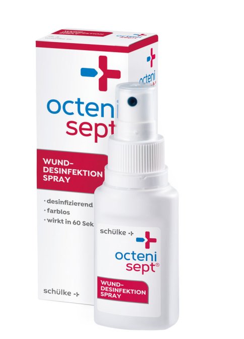 Beschreibung schülke Hautdesinfektion octenisept® Wund-Desinfektion Die Wund-Desinfektion octenisept® von schülke ist als antiseptisches Spray erhältlich, desinfiziert und reinigt Schnitt-, Kratz-und Schürfwunden sowie Blasen völlig schmerzfrei. Zur antiseptischen Wundversorgung kann octenisept® maximal 14 Tage verwendet werden. Seine schnelle Wirksamkeit schützt gegen Bakterien (inkl. MRSA), begrenzt gegen Viren und bekämpft ebenso Pseudomonas aeruginosa und Candida albicans. Um die volle Wirkung zu erhalten, muss die Wundfläche völlständig benetzt sein und mindestens 1 bis 2 Minuten einwirken, bevor weitere Maßnahmen vorgenommen werden. Schmerzfreies Auftragen Infektionsvorbeugend Schnelle Wirksamkeit Antiseptikum Infektionsschutz Mit Octenidin Farblos