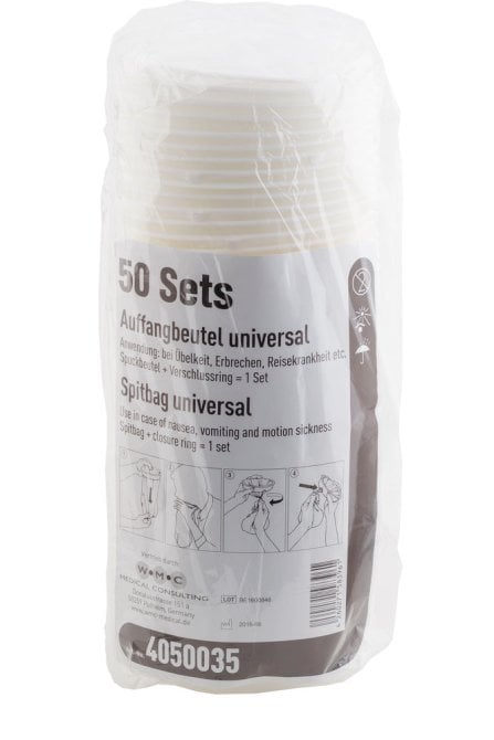Beschreibung Auffang- / Brechbeutel – Praktischer Begleiter Übelkeit und Brechreiz ist für die meisten Patienten mit einem unangenehmen Gefühl verbunden. Der Auffang- / Brechbeutel ist für das Personal in Klinik und Praxiseinrichtungenhierbei eine sichere und hygienische Lösung. Der Verschlussring ermöglicht das sofortige Verschließen, ohne das Gerüche austreten. Das praktische an dem Brechbeutel liegt des Weiteren darin, dass er auch im Liegen verwendet werden kann. Einmal-Brechbeutel bei Übelkeit, Erbrechen, Reisekrankheit usw. Farbe: weiß Set mit Spuckbeutel und Verschlussring