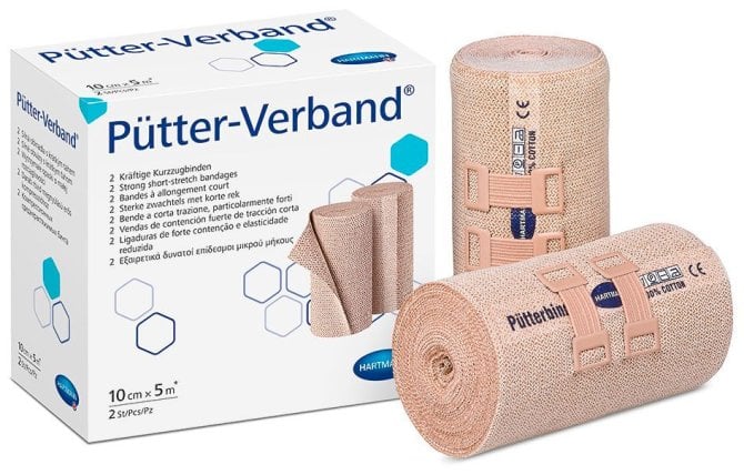 Die Hartmann Binden Pütter-Verband® sind hochwertige Kurzzugbinden, die in den Größen 8 cm und 10 cm erhältlich sind. Diese textilelastischen Kompressionsbinden zeichnen sich durch ihren hohen Arbeitsdruck bei gleichzeitig niedrigem Ruhedruck aus. Die Kompressionswirkung bleibt auch bei langfristiger Anwendung stabil, was sie ideal für Dauerverbände macht. Mit einer Dehnbarkeit von ca. 90 % bieten die Pütterbinden eine optimale Passform und sind gleichzeitig atmungsaktiv und hautverträglich. Hergestellt aus 100 % Baumwolle sind die Binden kochfest und bei 134°C dampfsterilisierbar. Sie sind in Hautfarbe erhältlich und können wahlweise mit oder ohne Verbandklammern geliefert werden. Jede Binde hat eine gedehnte Länge von 5 Metern und eine Breite von 10 cm. Die Hartmann Binden Pütter-Verband® sind die ideale Wahl für medizinische Einrichtungen und den Sprechstundenbedarf, die hochwertige und zuverlässige Kompressionsbinden benötigen. Mit ihrer stabilen Kompressionswirkung, der hohen Dehnbarkeit und der Hautverträglichkeit bieten sie optimalen Tragekomfort und Unterstützung. Wählen Sie die Hartmann Binden Pütter-Verband® für effektive Kompression und lang anhaltende Unterstützung bei der Wundversorgung.